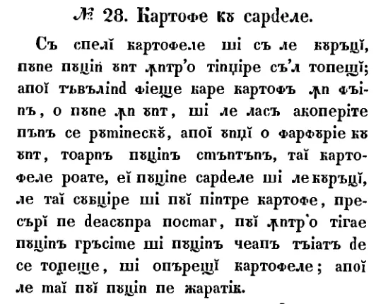 Cartofi cu sardele este o rețetă românească veche din 1842, prezentată cu ingrediente, preparare și context istoric. Pagina reunește transcrierea disponibilă, notele editoriale și imaginea manuscrisului original.